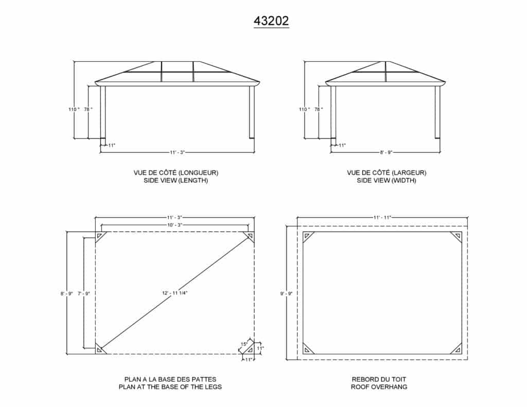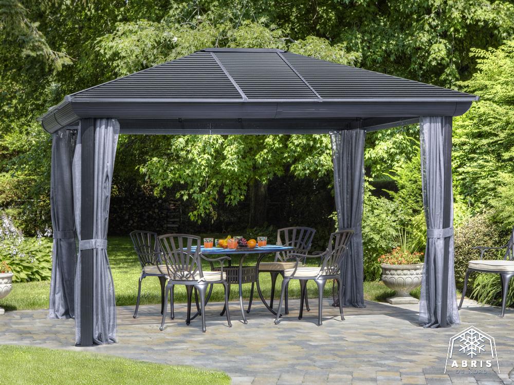 Relax in the shade under this Venus gazebo. Use screen curtains to keep insects out. This gazebo, made of extruded aluminum and reinforced polycarbonate roof, lets the sunlight in without letting ultraviolet rays get to you. It can be left in place all year round, saving you the hassle of setting up and dismantling at the end of the season. The Venus gazebo is a lovely blend of classic and modern design. It’s a perfect match for any home. The Venus gazebo is the perfect place to spend evenings with friends.