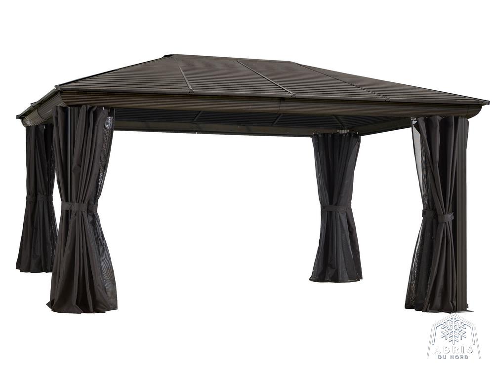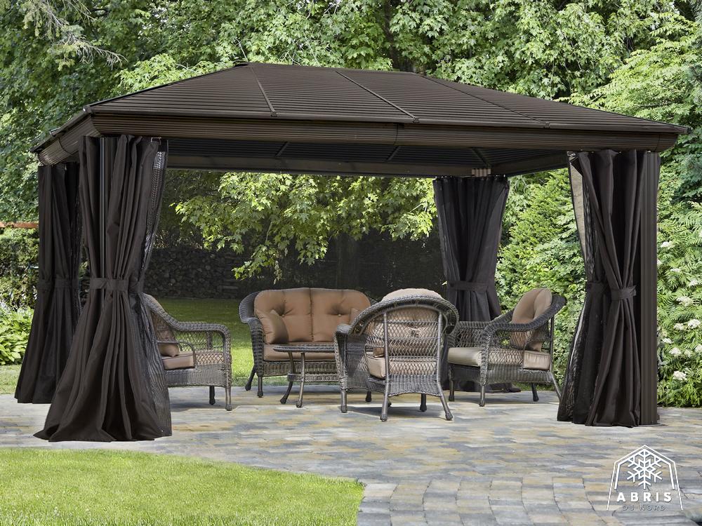 Relax in the shade under this Venus gazebo. Use screen curtains to keep insects out. This gazebo, made of extruded aluminum and reinforced polycarbonate roof, lets the sunlight in without letting ultraviolet rays get to you. It can be left in place all year round, saving you the hassle of setting up and dismantling at the end of the season. The Venus gazebo is a lovely blend of classic and modern design. It’s a perfect match for any home. The Venus gazebo is the perfect place to spend evenings with friends.