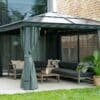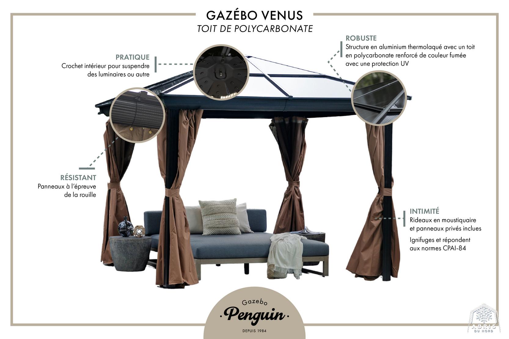 Relax in the shade under this Venus gazebo. Use screen curtains to keep insects out. This gazebo, made of extruded aluminum and reinforced polycarbonate roof, lets the sunlight in without letting ultraviolet rays get to you. It can be left in place all year round, saving you the hassle of setting up and dismantling at the end of the season. The Venus gazebo is a lovely blend of classic and modern design. It’s a perfect match for any home. The Venus gazebo is the perfect place to spend evenings with friends.
