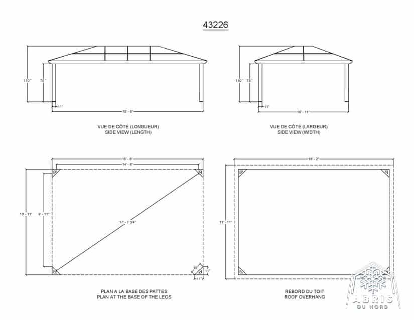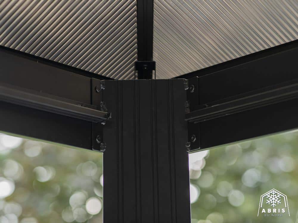 • Powder-coated aluminum structure with smoke-colored reinforced polycarbonate roof with UV protection or 0.75 mm galvanized steel roof.