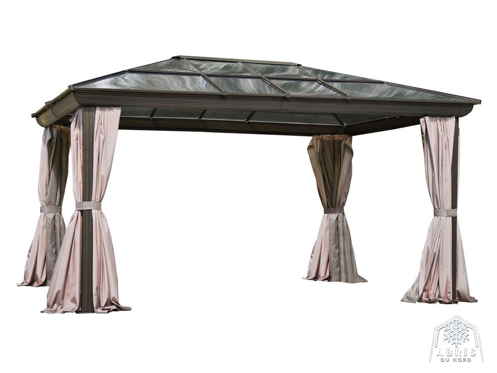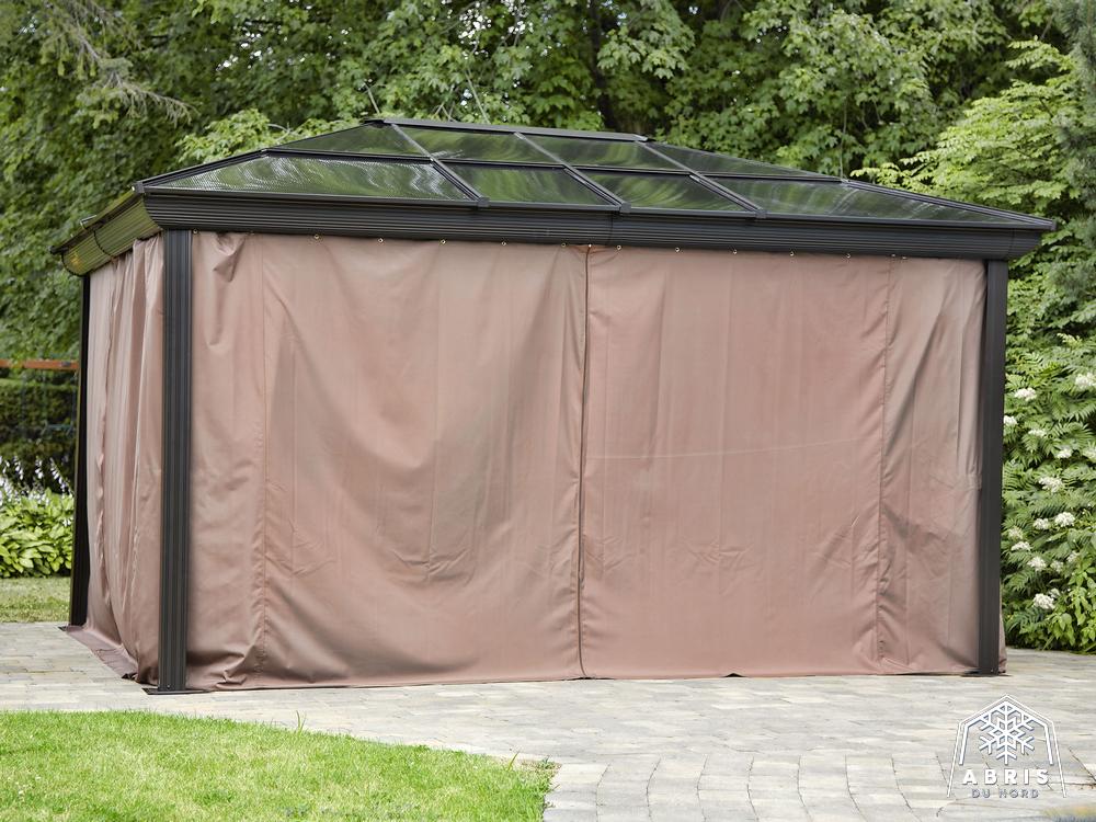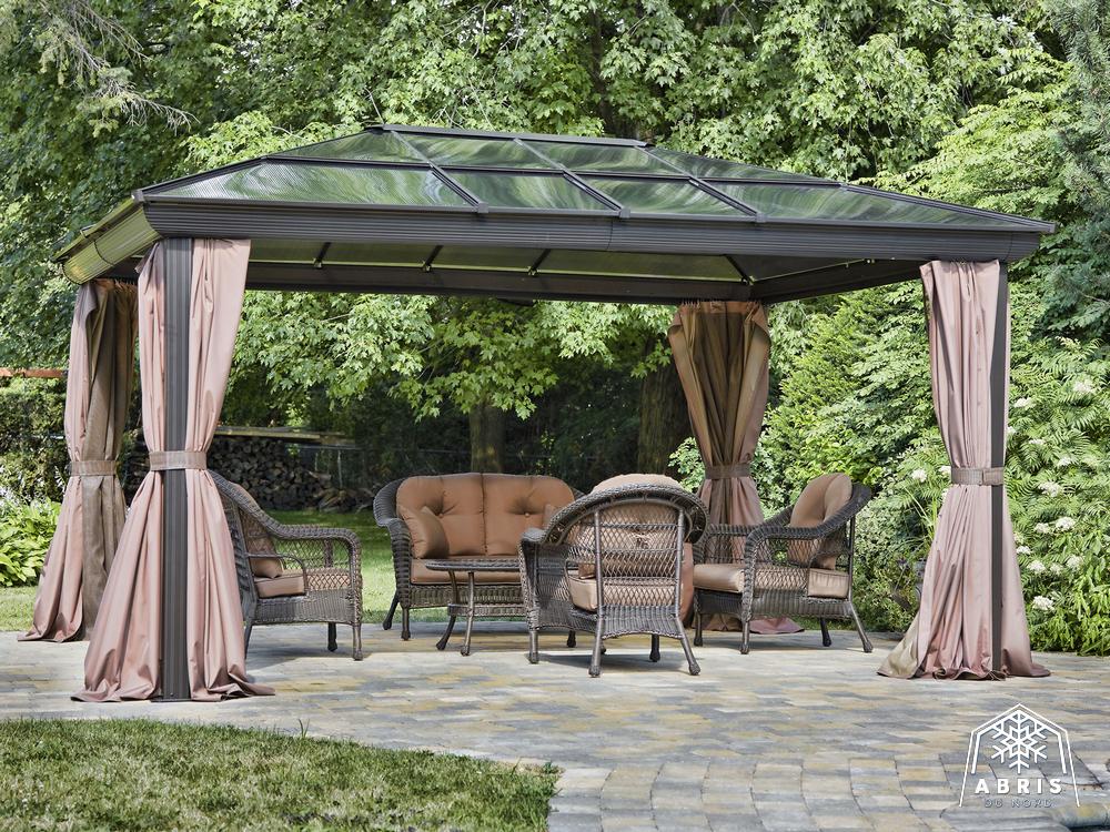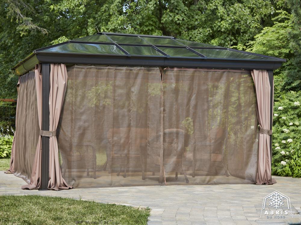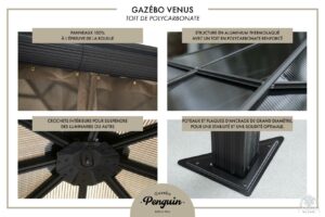 Relax in the shade under this Venus gazebo. Use screen curtains to keep insects out. This gazebo, made of extruded aluminum and reinforced polycarbonate roof, lets the sunlight in without letting ultraviolet rays get to you. It can be left in place all year round, saving you the hassle of setting up and dismantling at the end of the season. The Venus gazebo is a lovely blend of classic and modern design. It’s a perfect match for any home. The Venus gazebo is the perfect place to spend evenings with friends.