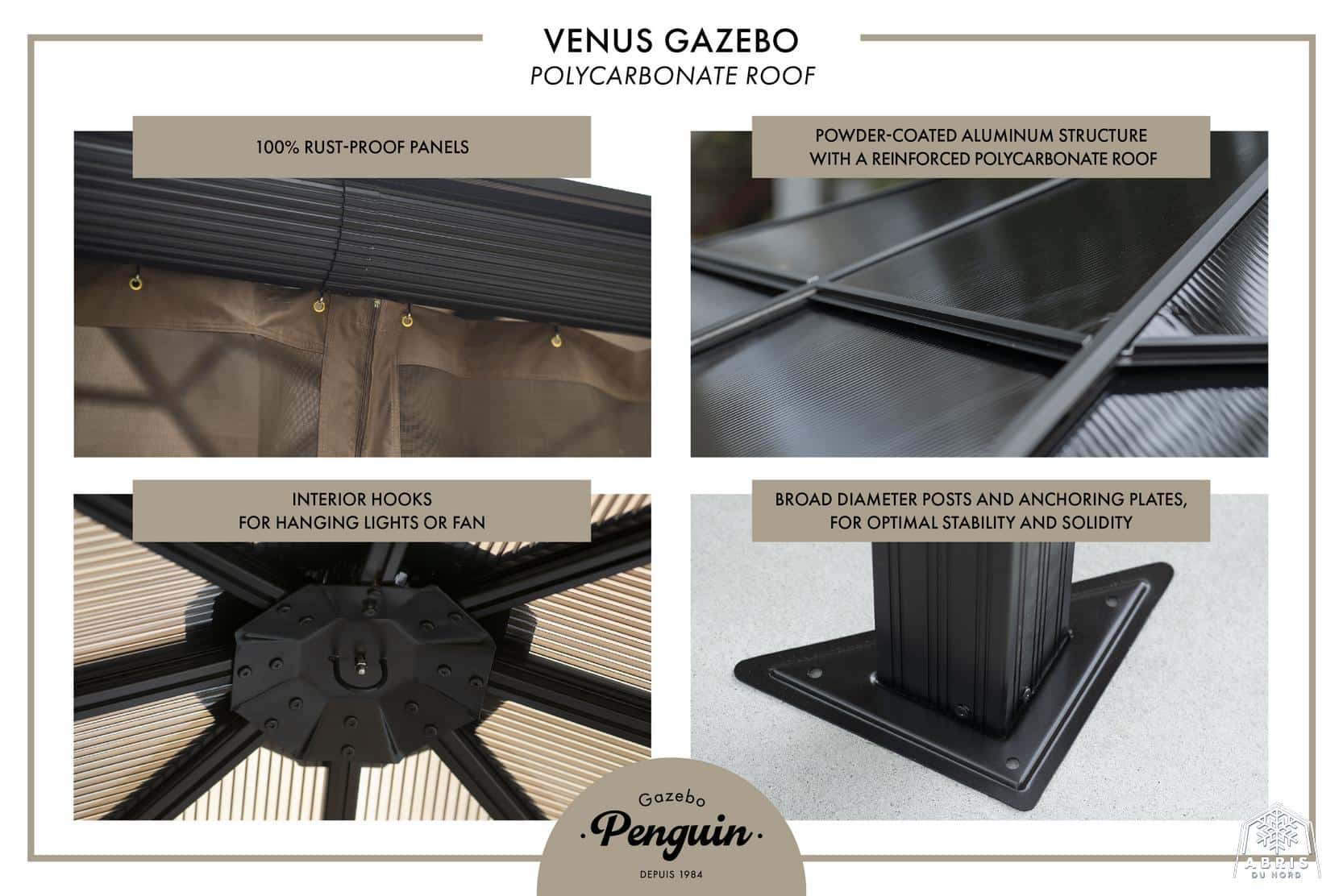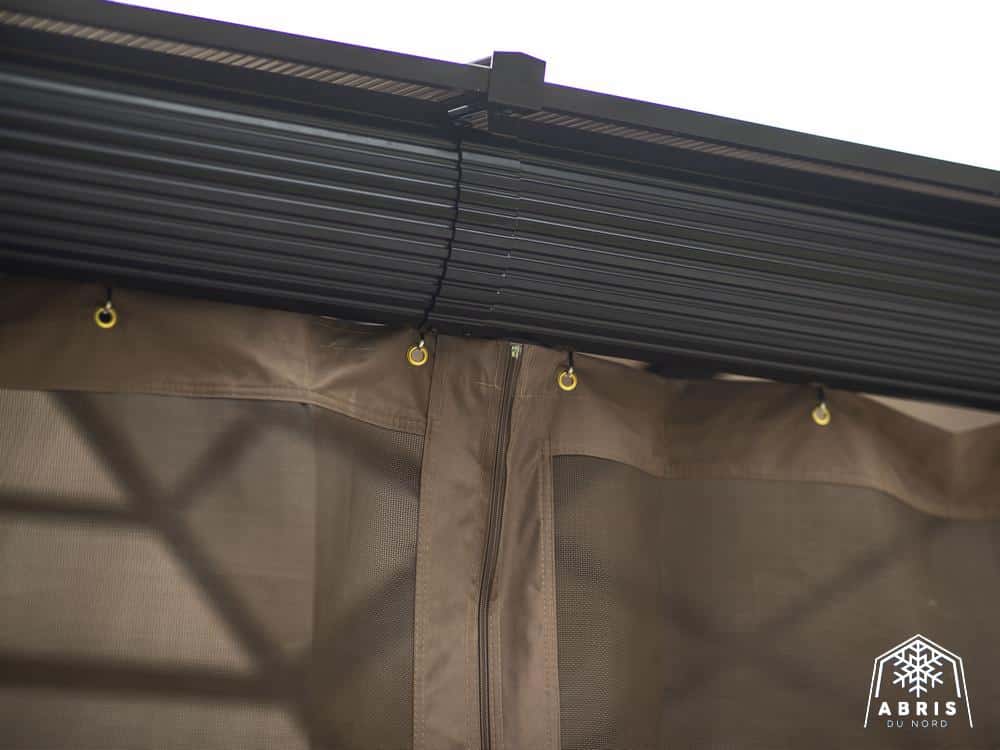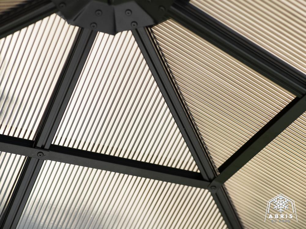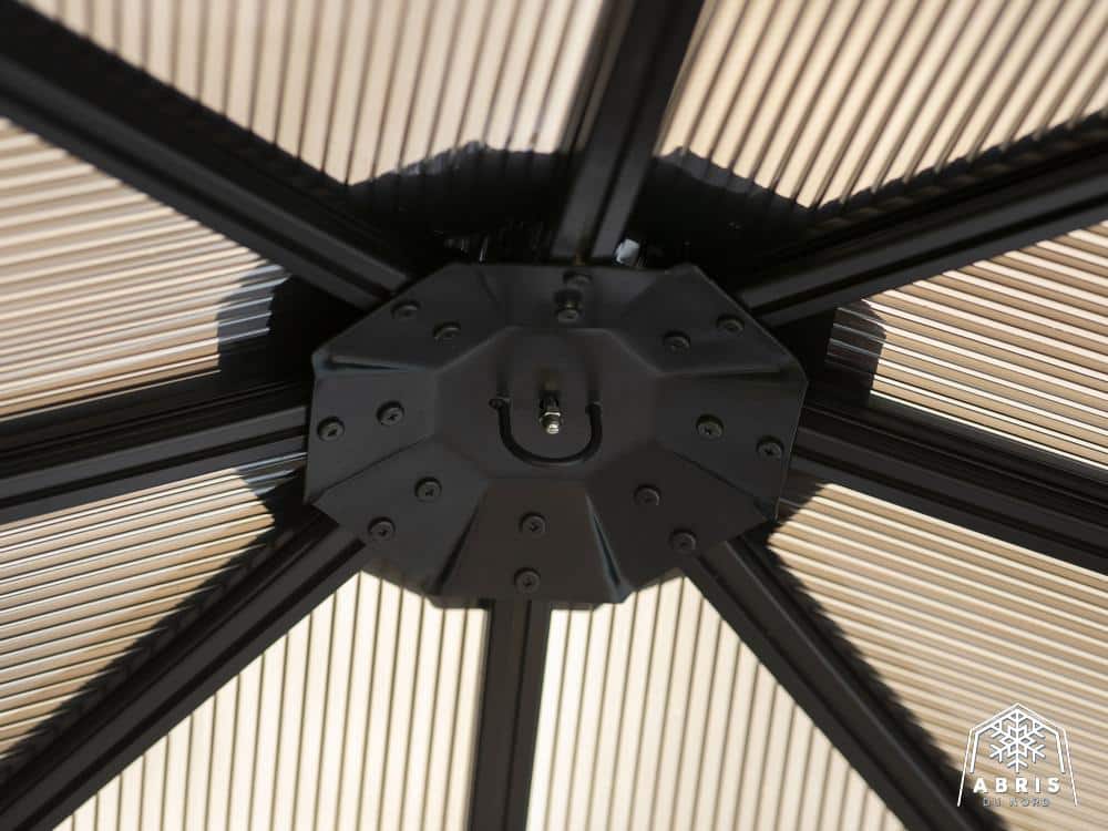 Relax in the shade under this Venus gazebo. Use screen curtains to keep insects out. This gazebo, made of extruded aluminum and reinforced polycarbonate roof, lets the sunlight in without letting ultraviolet rays get to you. It can be left in place all year round, saving you the hassle of setting up and dismantling at the end of the season. The Venus gazebo is a lovely blend of classic and modern design. It’s a perfect match for any home. The Venus gazebo is the perfect place to spend evenings with friends.
