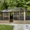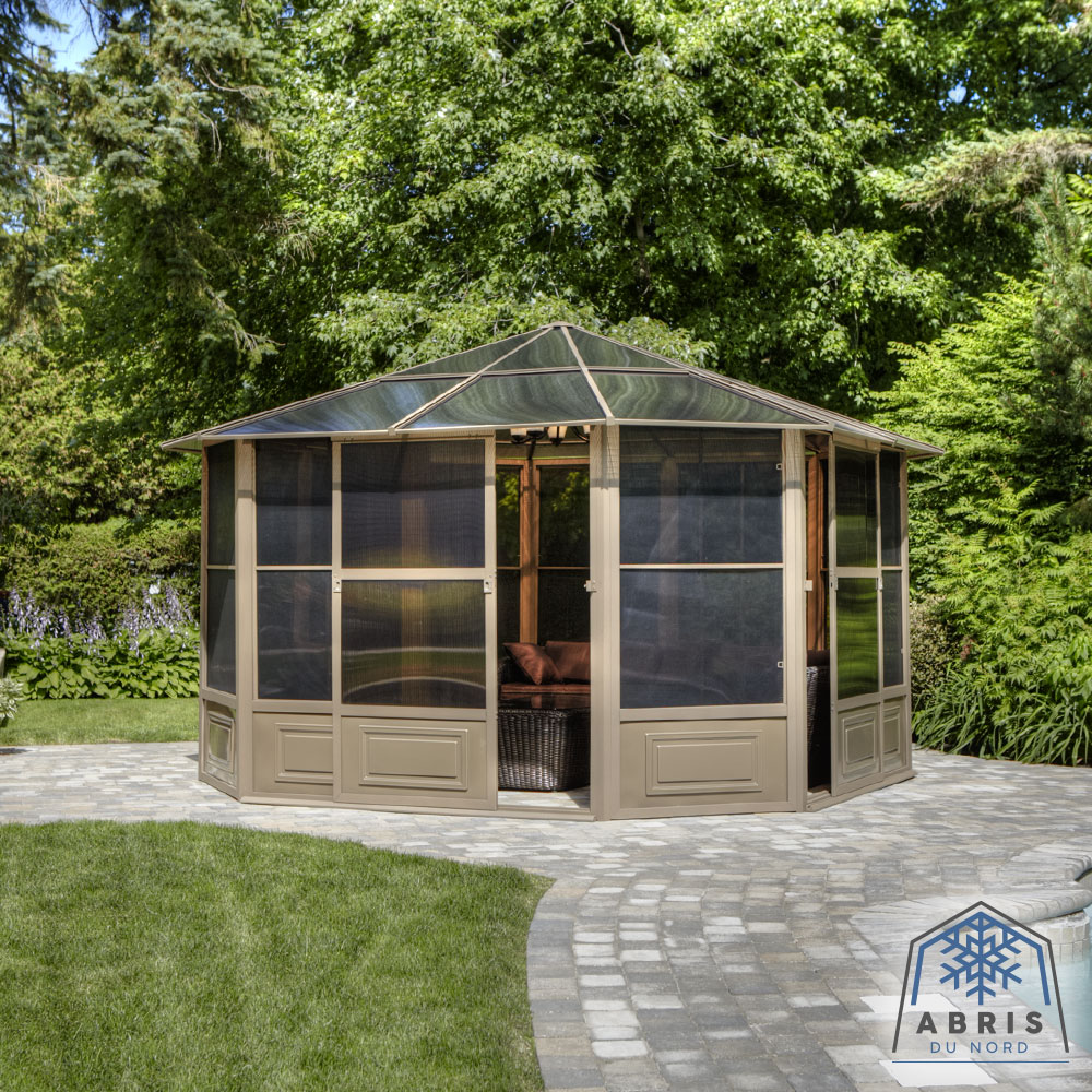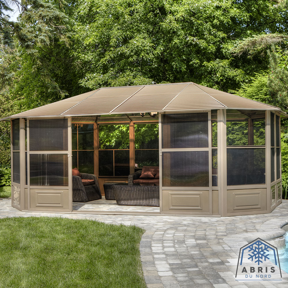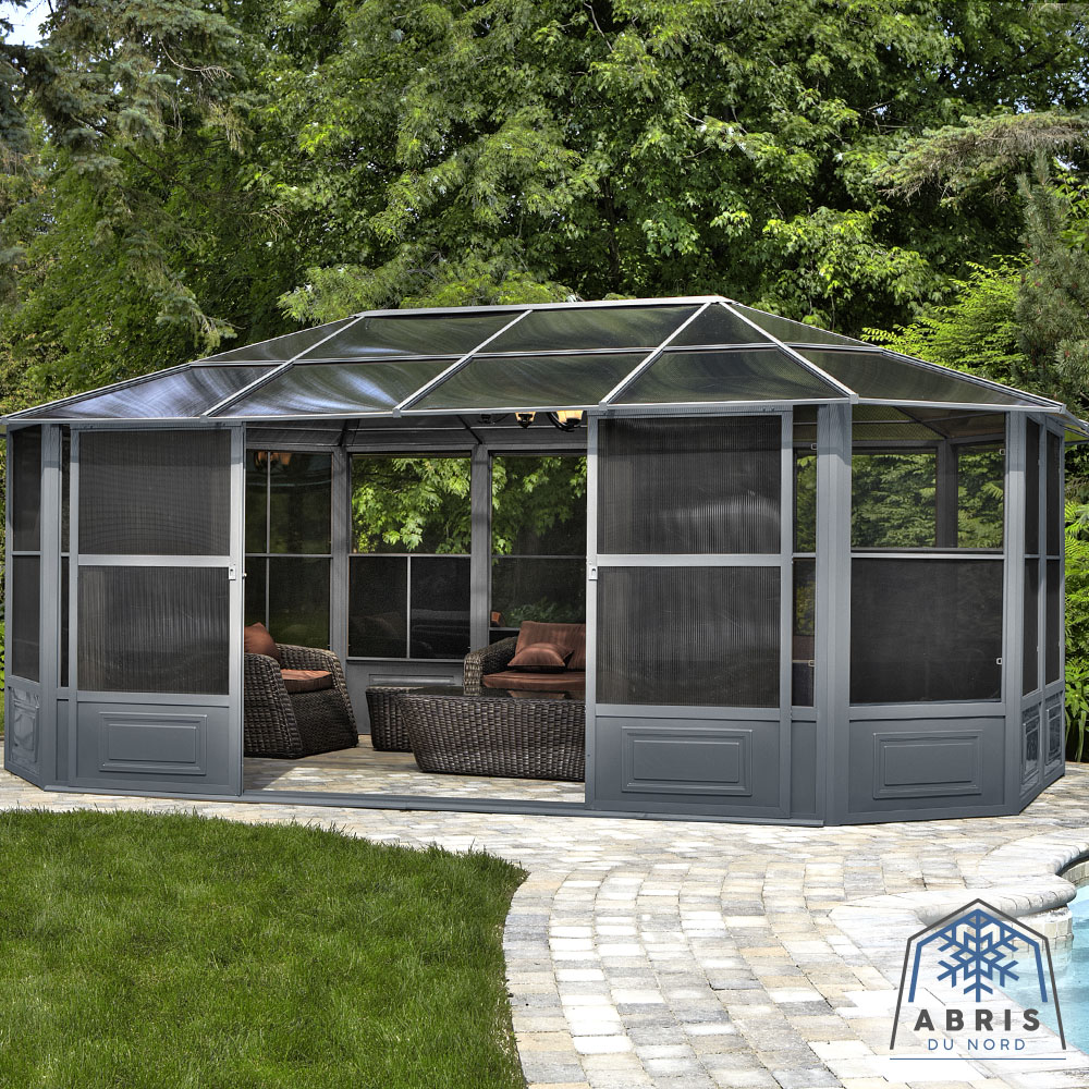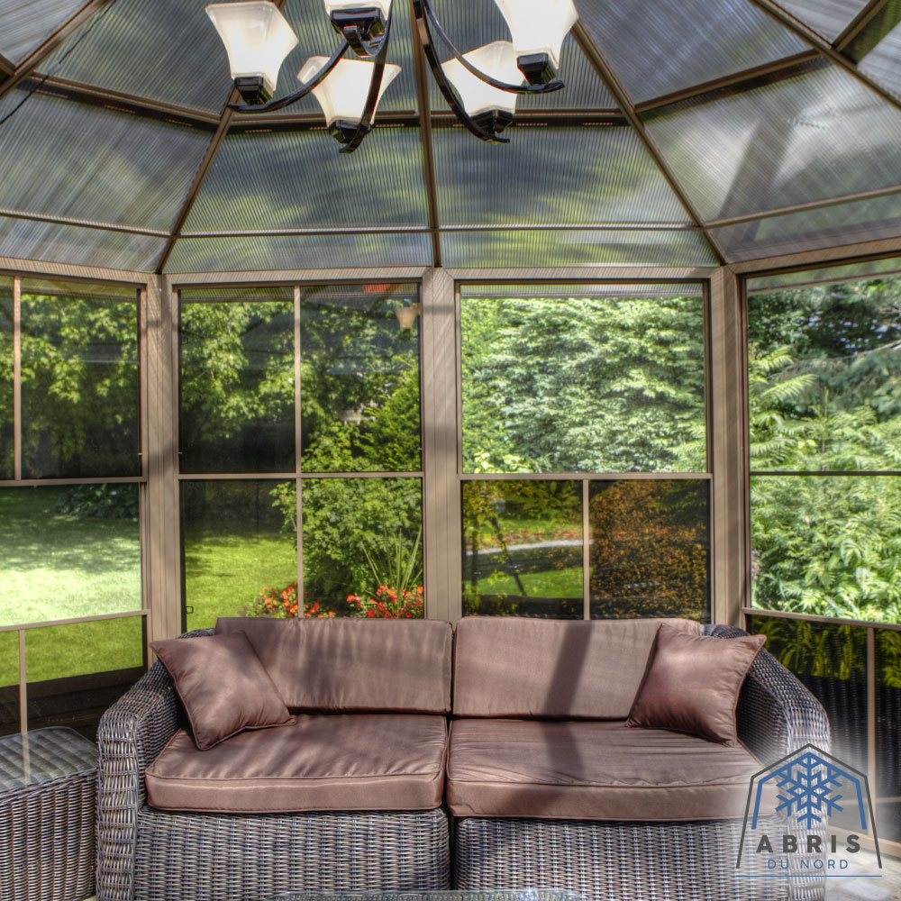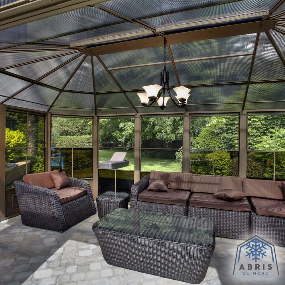 Extend the pleasure of your outdoor space with our Florence solarium. This extension of your home will provide the space needed to gather all your loved ones for an evening of dining and relaxation, or it can be used as an ideal shelter for your spa. This beautiful addition to your outdoor living space will shelter you from the elements for years to come while adding value to your property. This unit can be left in place all year round, saving you the hassle of setting up and taking down at the end of the season. The Florence solarium is constructed of extruded aluminum and features elegant reinforced polycarbonate roof panels, two sliding doors and 5-way ventilation panels. This solarium has been carefully designed to withstand rain, snow and UV rays.