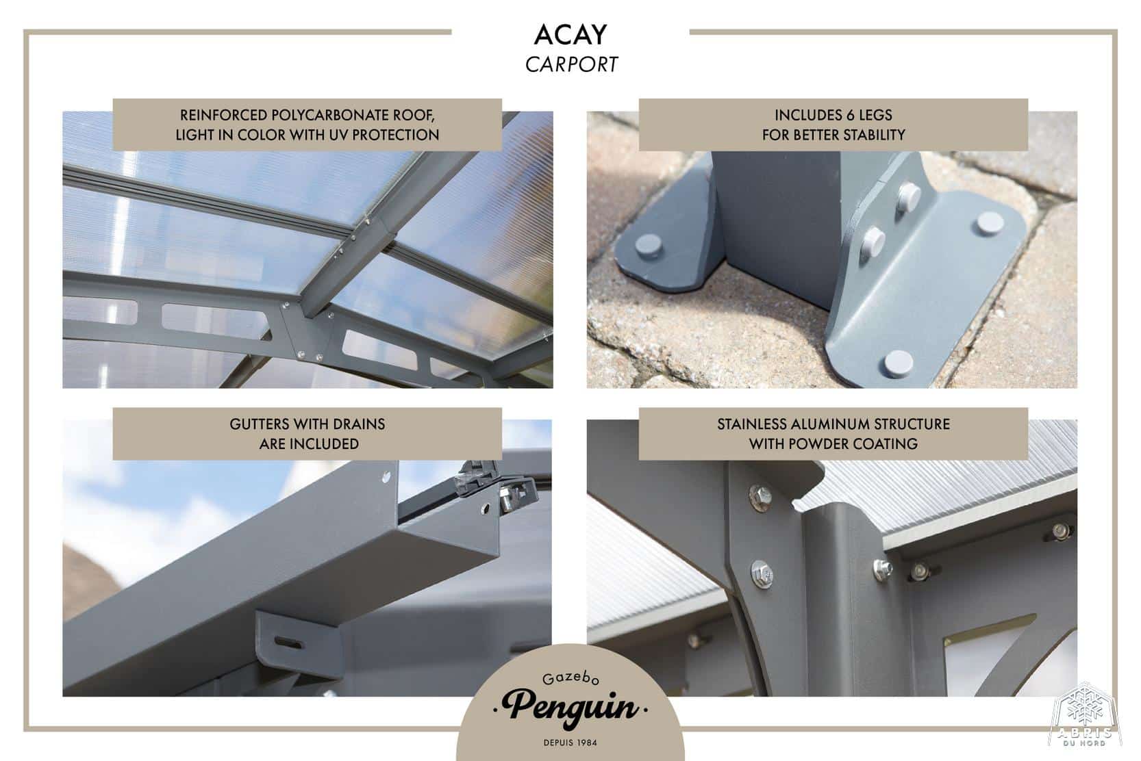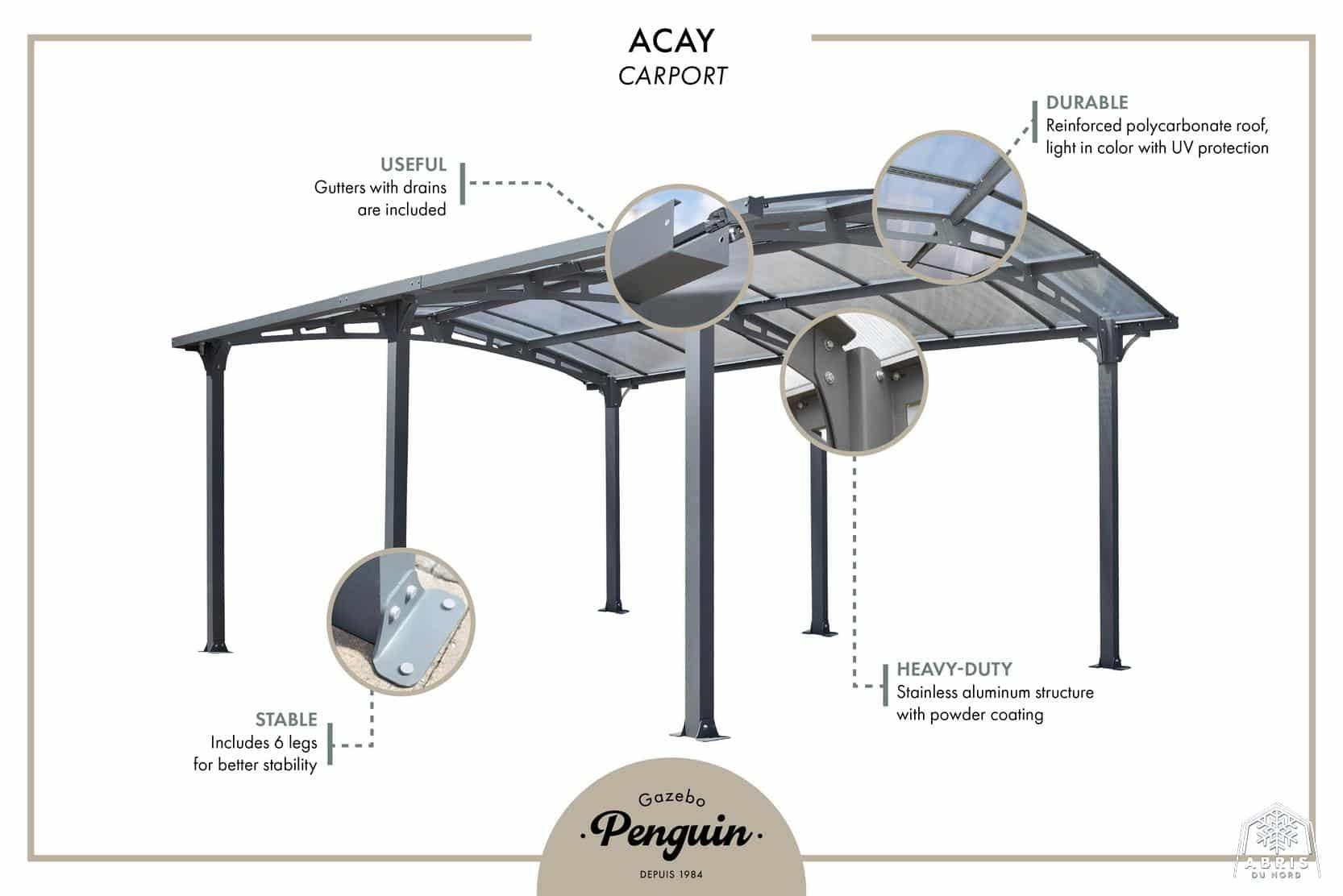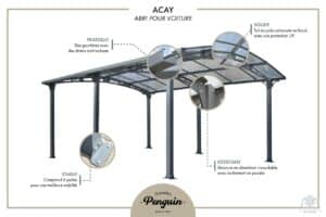 Améliorez l’apparence de votre propriété avec l’abri Acay. Il combine des matériaux de première qualité avec un concept innovant. Cette structure est parfaite pour protéger les bateaux, les véhicules, les tracteurs et même les aires de pique-extérieures. L’abri Acay est construit en aluminium extrudé et en acier qui résistent à la corrosion. L’unité comprend également des panneaux de polycarbonate traités contre les rayons UV et des gouttières. Elle offre une excellente protection pour les véhicules contre la neige et la pluie toute l’année.