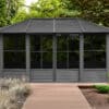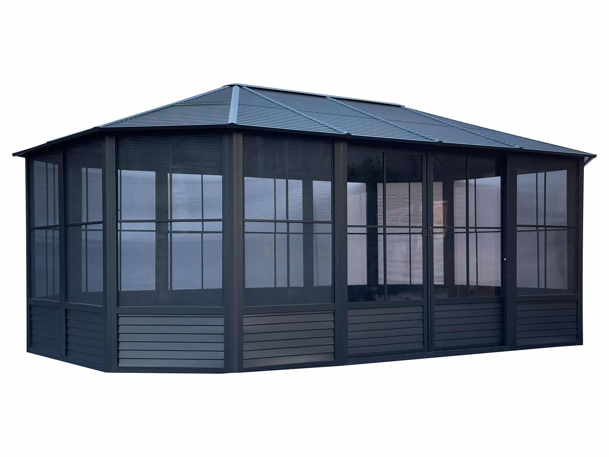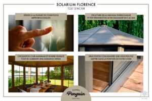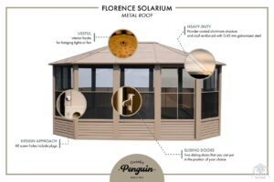 Prolongez le plaisir de votre espace extérieur avec notre solarium Florence. Cette extension de votre maison fournira l’espace nécessaire pour rassembler tous vos proches pour une soirée de dîner et de détente, ou elle peut être utilisée comme abri idéal pour votre spa. Ce bel ajout à votre espace de vie extérieur vous mettra à l’abri des éléments pour les années à venir tout en ajoutant de la valeur à votre propriété. Cette unité peut être laissée en place toute l’année, vous évitant ainsi les problèmes de montage et de démontage à la fin de la saison. Le solarium Florence est construit en aluminium extrudé et dispose d’élégants panneaux de toit en acier galvanisée, de deux portes coulissantes et de panneaux de ventilation à 5 positions. Ce solarium a été soigneusement conçu pour résister à l’exposition à la pluie, à la neige et aux rayons UV.