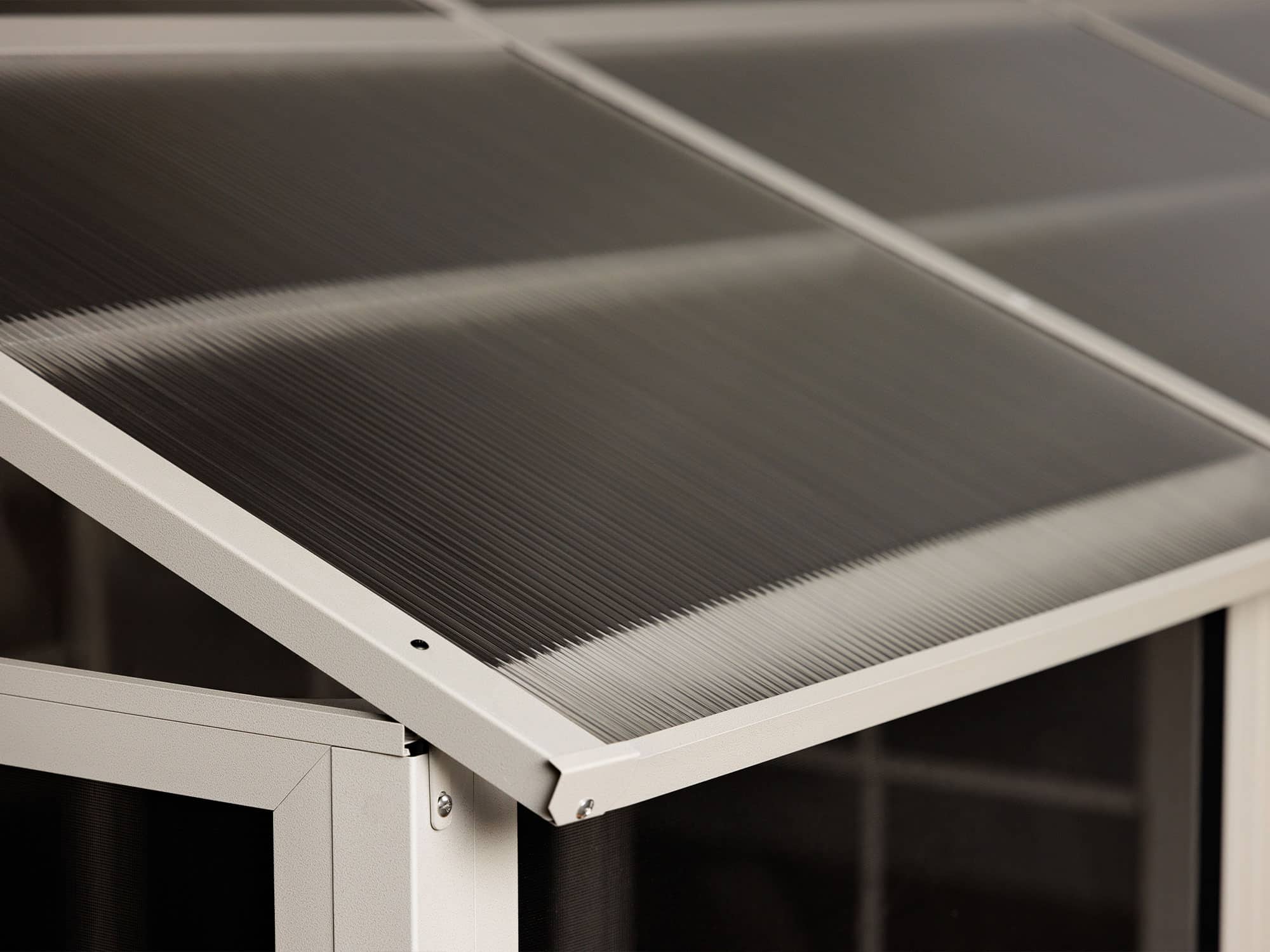 • Toit renforcé en polycarbonate de 6 mm avec protection UV intégrée
